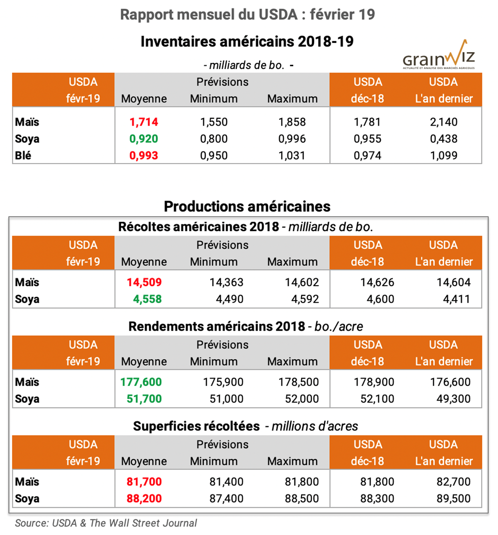 - Les rendements américains et superficies récoltées à l'automne dernier aux États-Unis. On se rappelle que la récolte aux États-Unis aura été difficile dans plusieurs régions en raison de conditions trop humides. Pour cette raison, on s'attend en moyenne à de nouvelles réductions à la baisse.