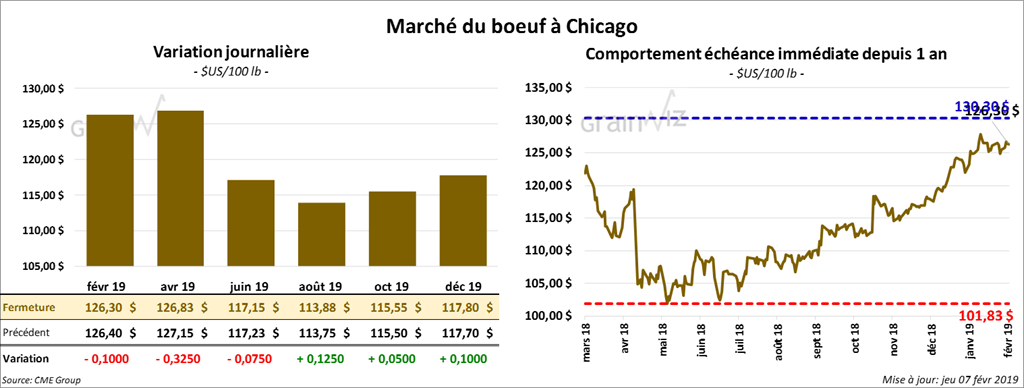 Les contrats de bœuf US ont eu une progression partagée. Ceux aux échéances les plus rapprochées ont clôturé au neutre à baissier de 32,5 cents. Par contre, les contrats aux échéances les plus éloignées ont terminé en hausse.