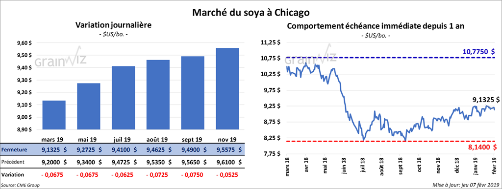 Les contrats de soya à Chicago ont terminé la journée en baisse de 6 ¼ à 8 ½ cents. Ils avaient pourtant rebondi après des reculs de 2 chiffres observés vers le milieu de la session. Les contrats de tourteau ont également fini dans le rouge de 3,50 $/tonne. L’huile a perdu 9 points.