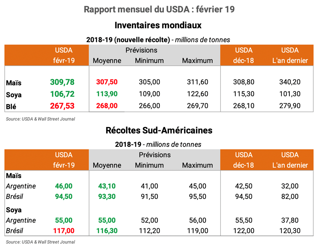 - Pour l’Amérique du Sud, le USDA demeure conservateur concernant les répercussions des mauvaises conditions au Brésil, avec une production abaissée de -5 à 117 millions de tonnes alors que certaines organisations prévoient aussi peu que 112-113 millions de tonnes. Par contre, toujours au Brésil, le USDA se montre confiant que la production de maïs sera au rendez-vous, avec une récolte qui demeure prévue à 94,5 millions de tonnes.