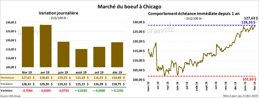 Les contrats de bœuf US aux échéances les plus rapprochées ont fini la session en baisse de 70 cents. Ceux différés ont, par contre, clôturé dans le vert. Les contrats de veau ont aussi terminé en progression partagée. Ceux aux échéances les plus rapprochées ont clôturé en baisse de 12,5 à 65 cents. Toutefois, les contrats aux échéances les plus éloignées ont fini à la hausse.