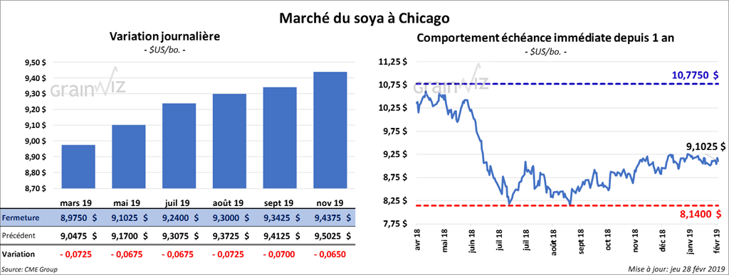Malgré les bonnes données sur les ventes à l’exportation, la majorité des contrats de soya à Chicago ont clôturé dans le rouge de 5 à 6 ½ cents. Les contrats de tourteau aux échéances les plus rapprochées ont également terminé en baisse de 2,70 $/tonne. Par contre, l’huile a gagné 16 points.