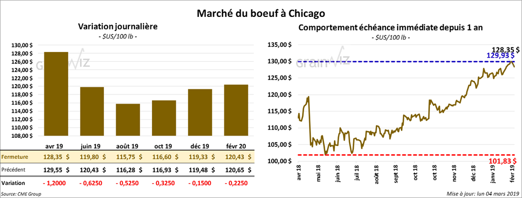 La majorité des contrats de bœuf à Chicago ont fini la journée au neutre à baissier de 1,20 $. Les contrats de veau ont eu une progression partagée. Ceux aux échéances les plus rapprochées ont clôturé en baisse. Ceux différés ont plutôt terminé la session au neutre à haussier de 1,075 $.
