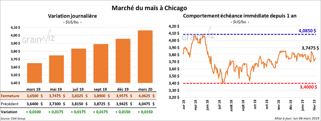 Dans la semaine du 28 février dernier, les inspections à l’exportation de maïs US ont été de 865,617 tonnes, une hausse de 13,65 % par rapport à la semaine précédente, mais également une baisse de 11,68 % comparativement à la même période en 2018. Sur une base annuelle, les exportations de maïs US sont de 35,95 % plus élevées que l’an dernier avec 25,798 millions de tonnes.