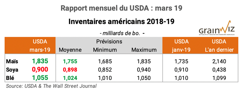 Voici un aperçu des nouvelles prévisions du USDA avec la publication de son rapport mensuel de mars 2019. Pour accéder au rapport complet (en anglais): WASDE Mars 19