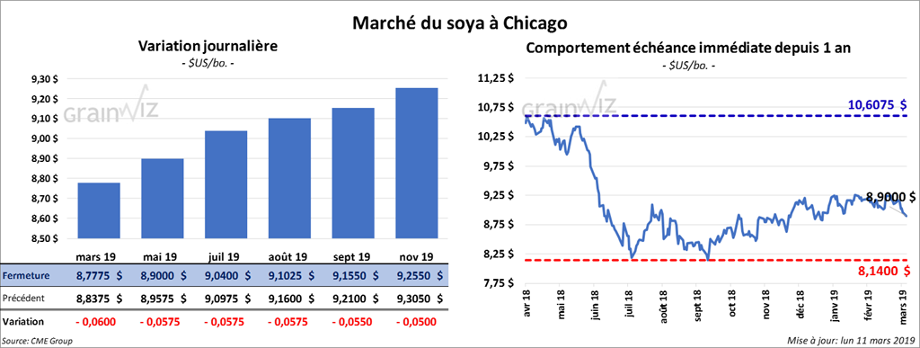 Dans la semaine du 7 mars dernier, les inspections à l’exportation de soya US ont été de 874,363 tonnes, ce qui correspond à une légère hausse par rapport à la semaine précédente. Il s’agit également d’une baisse de 6 % comparativement à la même période l’an passé. Un total de 386,581 tonnes a été exporté vers la Chine.