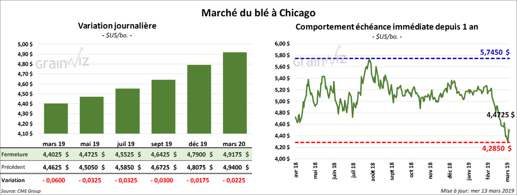 La plupart des contrats de blé US ont clôturé en baisse de 5 à 10 ¼ cents. Le contrat mars 19, qui s’approche de son expiration, s’échangeait à un volume peu élevé.