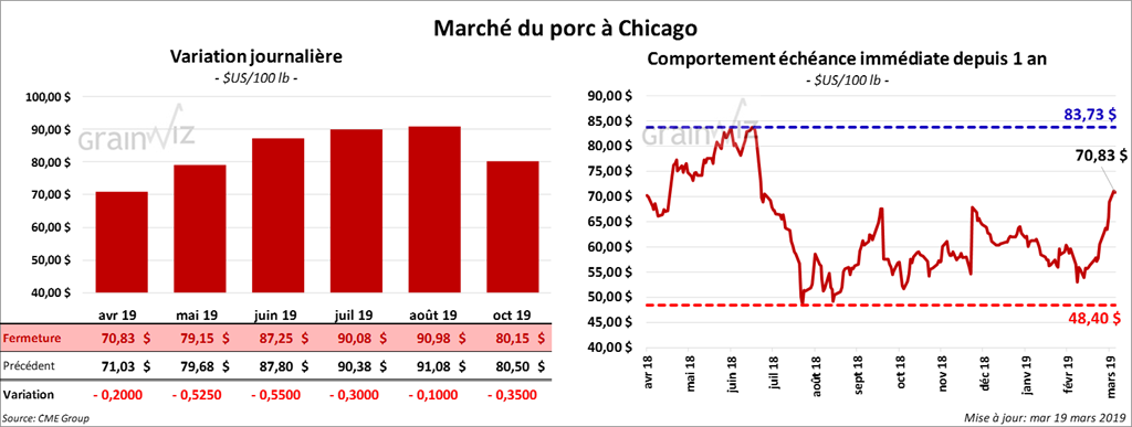 Le 15 mars dernier, le CME Lean Hog Index était en hausse de 1,14 $ comparativement au jour précédent à 56,54 $. Cet après-midi, la valeur moyenne des découpes de porc US a été en progression de 1,75 $ à 74,14 $. Le flanc était la seule découpe en baisse (50 cents). Sur une base nationale, le prix moyen au comptant de la carcasse a été en hausse de 1,20 4 à 57,46 $.