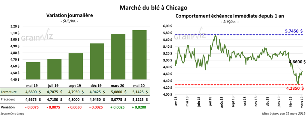 La majorité des contrats de blé d’hiver US ont terminé la journée au neutre à baissier de 2 cents. À Minneapolis, les contrats ont eu une progression partagée. La force du dollar US a exercé une pression sur le marché. Pour la semaine, à Chicago et à Kansas, les contrats aux échéances les plus rapprochées ont enregistré des gains légers. Toujours pour la semaine, à Minneapolis, les contrats de blé US aux échéances les plus rapprochées ont gagné 3,15 %.