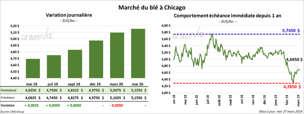 La majorité des contrats de blé US ont clôturé au neutre à haussier de 1 ½ cents. La faiblesse des cours du maïs US ont également limité les gains.