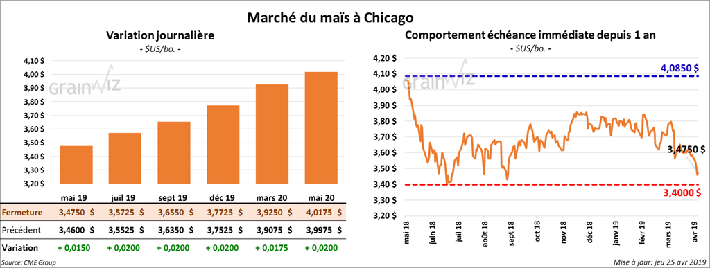 Les contrats de blé à Chicago et à Minneapolis ont fini la journée en hausse d’une fraction à 3 cents. À Kansas, les contrats ont terminé sur une note partagée. Les options mai 19 expirent demain.