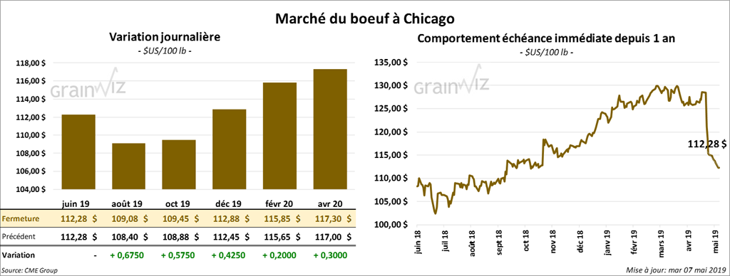 Pour la première fois depuis les 12 dernières sessions, les contrats de bœuf à Chicago ont terminé la session dans le vert. Le contrat juin 19 est demeuré toutefois inchangé. Les contrats de veau ont fini la journée en hausse de 65 cents à 1,275 $.