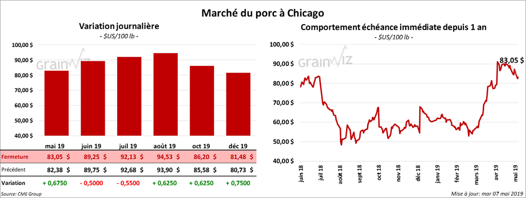 La majorité des contrats de porc à Chicago ont terminé la session en hausse de 62,5 cents à 2,625 $. Les contrats juin 19 et juillet 19 ont toutefois clôturé en baisse de 50 à 55 cents.