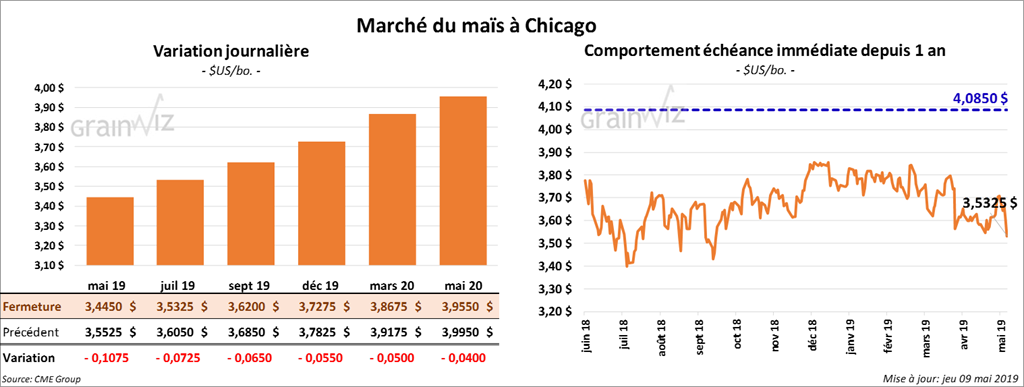 Ce matin, le rapport hebdomadaire sur les ventes à l’exportation de la semaine du 2 mai dernier a indiqué une nette réduction des ventes de 149,123 tonnes de soya US 2018/2019. Les analystes s’attendaient à un résultat entre 300,000 et 650,000 tonnes. Les ventes de la récolte de 2019/2020 ont été de 259,592 tonnes.