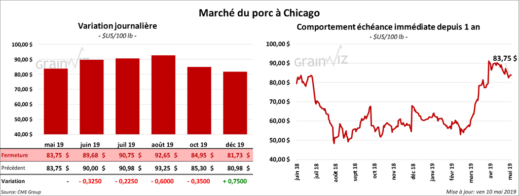 Les contrats de porc US aux échéances les plus rapprochées ont fini la session au neutre à baissier de 60 cents. Les contrats différés ont clôturé en hausse. Pour la semaine, le contrat juin 19 a perdu 3,32 %.
