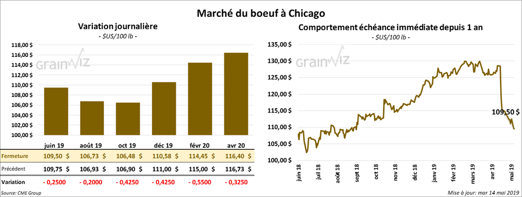 La majorité des contrats de bœuf à Chicago ont terminé la journée en baisse de 20 à 55 cents. Les contrats de veau ont été sous pression alors que ceux de maïs US étaient en progression de deux chiffres. Par conséquent, ils ont fini la session en baisse de 60 cents à 1,175 $. Le contrat mai 19 a clôturé en hausse de 95 cents.