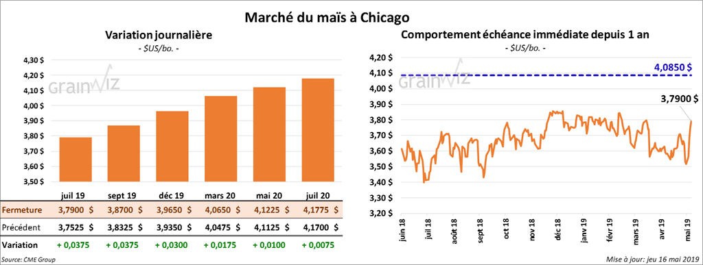 La plupart des contrats de maïs aux échéances les plus rapprochées ont terminé la journée en hausse de 4 à 9 ½ cents. Le secteur continue d’être influencé par les conditions météo.