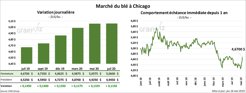 Les contrats de blé d’hiver US ont fini la session en hausse de 13 à 18 ¼ cents. À Minneapolis, la progression a été de 7 à 11 ½ cents.
