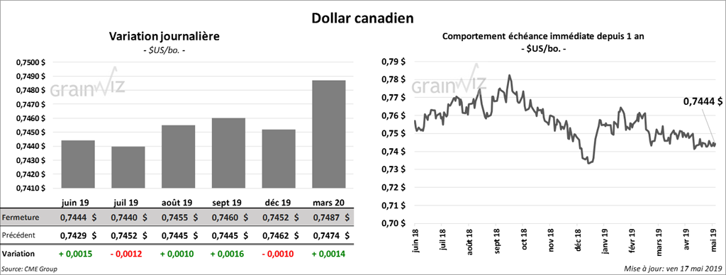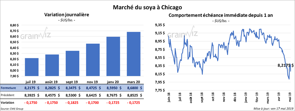Vers la fin de la session, les contrats de soya à Chicago étaient faibles. Ceux aux échéances les plus rapprochées ont clôturé en baisse de 17 à 18 ¼ cents. Les inquiétudes concernant le maïs, qui ont engendré la possibilité d’un changement de culture vers le soya, ont exercé une pression négative sur le secteur. Pour la semaine, le contrat de soya juillet 19 a gagné 1,54 %. Dans le cas du tourteau, la baisse a été de 7,60 $/tonne. Pour la semaine, le contrat de tourteau juillet 19 a progressé de 2,44 %. L’huile de soya a fini la journée en baisse de 50 points.