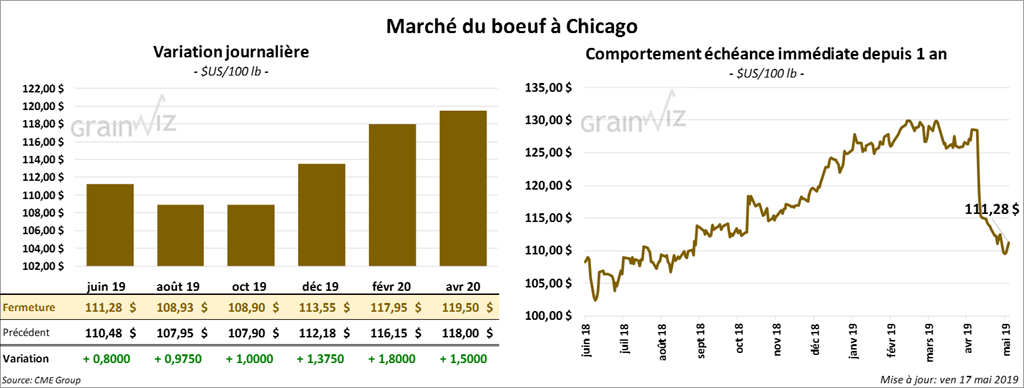 La majorité des contrats de bœuf ont terminé la journée avec des gains de 80 cents à 1,80 $. Quant aux contrats de veau, celui mai 19 a fini la session en hausse de 30 cents. Les autres contrats ont également terminée la journée en progression de 2 $ à 2,625 $.