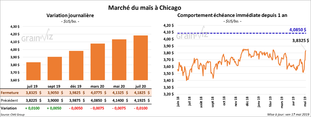 Les contrats de maïs US aux échéances les plus rapprochées ont terminé la journée en hausse de 4 ¼ cents. Pour la semaine, le contrat juillet 19 a progressé de 8,96 %. Les achats étaient liés à la lenteur des semis et à l’impact qu’elle aura sur la superficie finale ou le rendement.