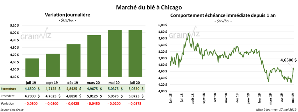 À Chicago, les contrats de blé ont terminé la session en baisse de 1 à 2 cents. Il y a eu des prises de profits sur le contrat juillet 19 qui, pour la semaine, a progressé de 9,48 %. À Kansas, les contrats ont baissé par rapport à leur haut, mais ils sont demeurés fermes. À la fin de la journée, ils étaient à la hausse de 3 ½ cents. Pour la semaine, le contrat juillet 19 a gagné 8,59 %. À Minneapolis, les contrats ont clôturé en progression de 2 cents et pour la semaine, ils ont pris 2,08 %.