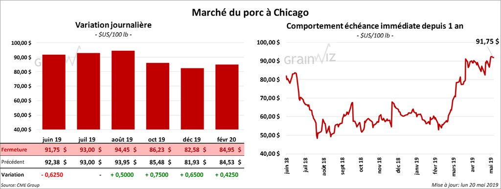 Les contrats de porc à Chicago ont terminé la session sur une note partagée. Le contrat juin 19 a fini en baisse de 62,5 cents, mais les contrats différés ont clôturé au neutre à haussier de 75 cents.