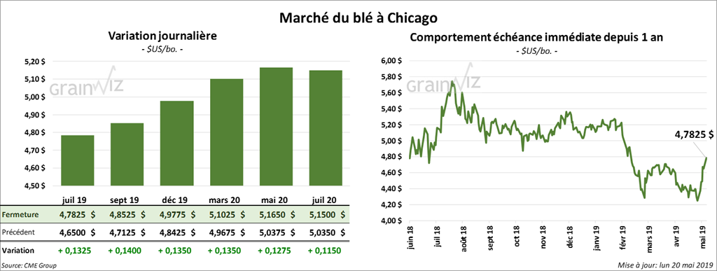 Les contrats de maïs à Chicago ont terminé la journée avec des gains de 2 à 6 ½ cents. Les averses au cours du week-end et les autres qui sont prévues à l’ouest du Corn Belt ont fourni un support au marché.