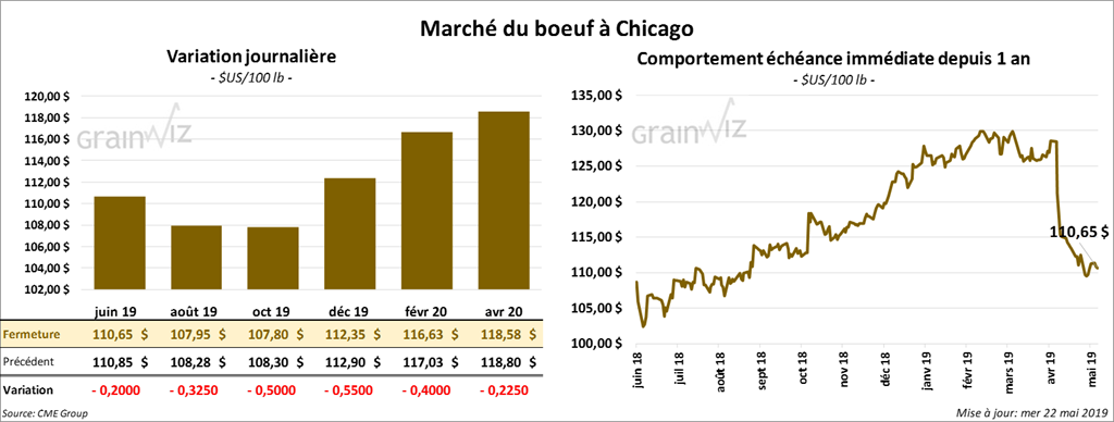 Vers midi, les contrats de bœuf US étaient en baisse de 25 à 80 cents. Au même moment, les contrats de veau US ont été dans le rouge de 80 à 1,10 $. Le contrat mai 19, qui devrait expirer bientôt, était en hausse de 35 cents. À la fermeture du marché, la plupart des contrats de bœuf US ont terminé en baisse. Les contrats de veau ont également clôturé en recul, mais le contrat mai 19 a fini en hausse de 15 cents.