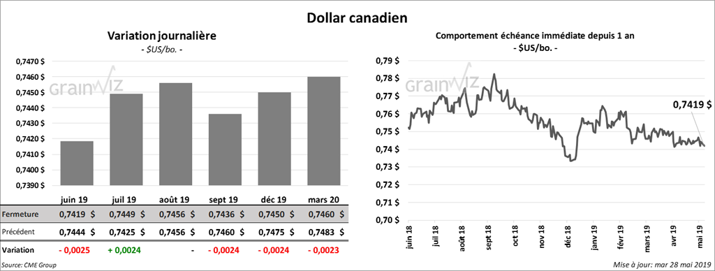 Les contrats de bœuf à Chicago ont terminé la journée sur une note partagée. Le contrat juin 19 a progressé de 37,5 cents alors que celui août 19 a reculé de 17,5 cents. Les spéculateurs ont ignoré les résultats plutôt légers du rapport Cattle on Feed qui avaient été présentés vendredi dernier. Les inventaires au 1er mai étaient pourtant un record. Les contrats de veau ont fini la session en baisse de 92,5 cents à 1,65 $.