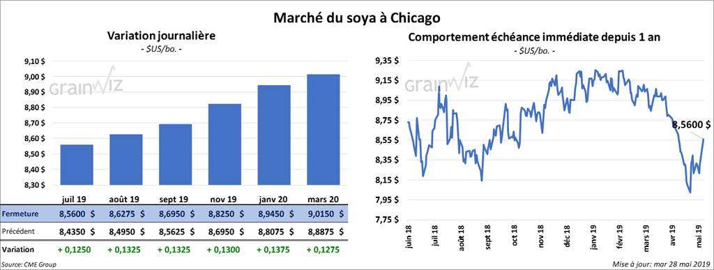 La plupart des contrats de soya US aux échéances les plus rapprochées ont terminé la journée avec des gains de 26 à 26 ¼ cents. Dans le cas du tourteau, le contrat juillet 19 a progressé de 12,30 $/tonne, une hausse de 4,09 %. L’huile a gagné 28 points.