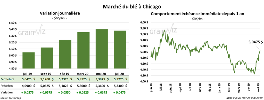 La majorité des contrats de blé d’hiver US ont fini la session en hausse de 10 à 18 ¾ cents. À Minneapolis, la plupart des contrats ont clôturé avec des gains de 5 à 9 ¾ cents.