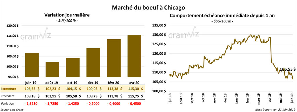 Les contrats de bœuf ont fini la session en baisse de 40 cents à 1,725 $. Les contrats de veau ont également perdu entre 1,025 $ et 1,325 $.