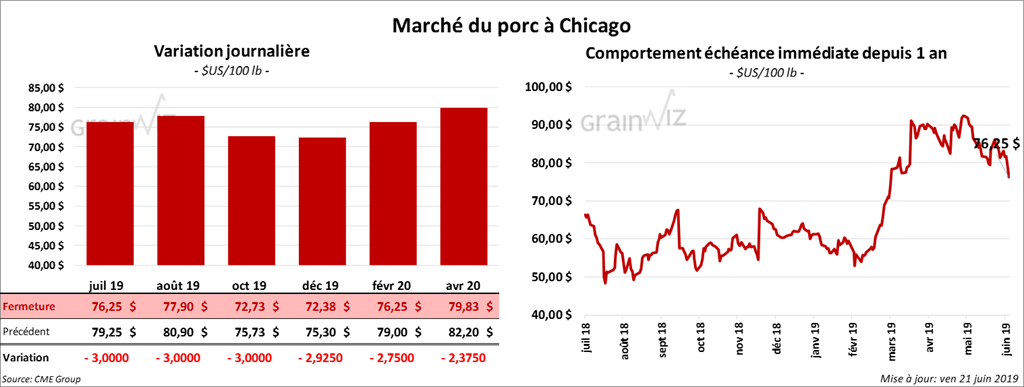 Le 19 juin dernier, le CME Lean Hog Index était en hausse de 6 cents par rapport au jour précédent à 79,55 $. Cet après-midi, la valeur moyenne des découpes a été en baisse de 71 cents à 76,73 $. Sur une base nationale, le prix moyen au comptant était en recul de 69 cents à 74,03 $.