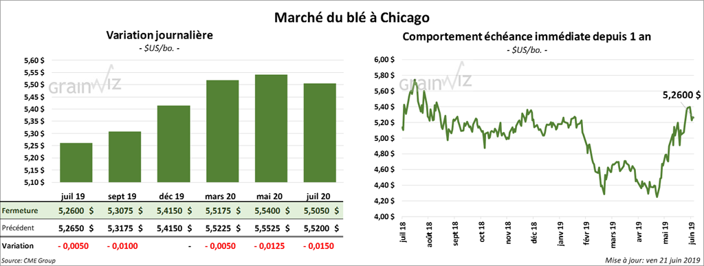 Les contrats de maïs US ont terminé la session en baisse de 6 à 8 cents. Ceux aux échéances les plus rapprochés ont clôturé à une cent de leur bas. Les options juillet 19 ont expiré aujourd’hui. Pour la semaine, les contrats juillet 19 ont perdu 2,37 %.