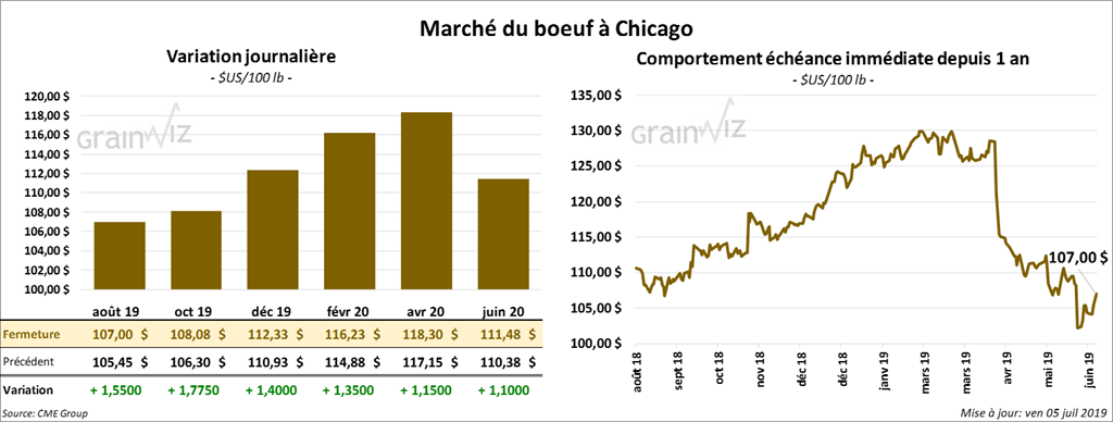 La plupart des contrats de bœuf à Chicago ont terminé la semaine avec des gains de 1,15 $ à 1,775 $. Pour la semaine, le contrat août 19 a progressé de 2,54 %. Les contrats de veau ont également fini la journée dans le vert de 1,125 $ à 2,25 $. Pour la semaine, le contrat août 19 a gagné 1,44 %.