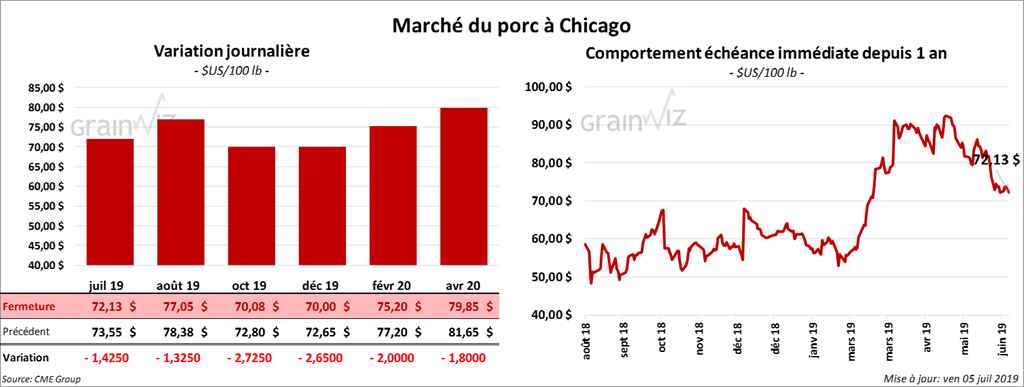 Le 2 juillet dernier, le CME Lean Hog Index était en baisse de 79 cents par rapport au jour précédent à 73,22 $. Cet après-midi, la valeur des découpes a été en hausse de 1,69 $ à 73,17 $. Sur une base nationale, le prix moyen au comptant de la carcasse était en recul de 1,32 $ à 65,82 $.
