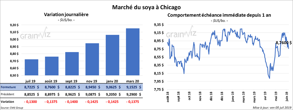 Les contrats de soya à Chicago ont fini la session en baisse de 13 à 14 ¼ cents. Les contrats de tourteau aux échéances les plus rapprochées ont terminé la journée en baisse de 2,20 $/tonnes. L’huile a perdu 58 points.