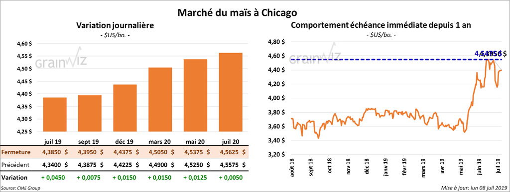 La majorité des contrats de maïs à Chicago ont clôturé dans le vert. Le contrat juillet 19 a lui-même terminé en hausse de 4 ½ cents.