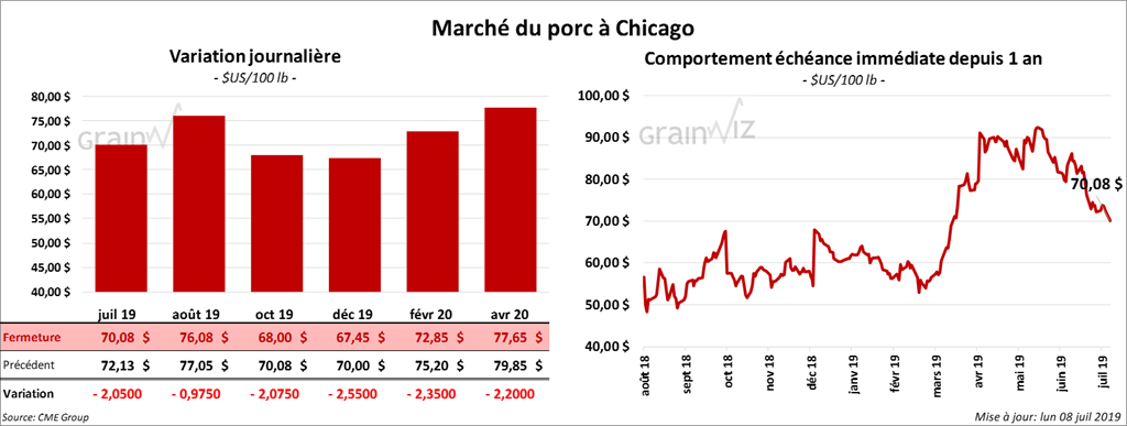 Les contrats de porc US aux échéances les plus rapprochées ont fini la journée en baisse de 97,5 cents à 2,075 $.