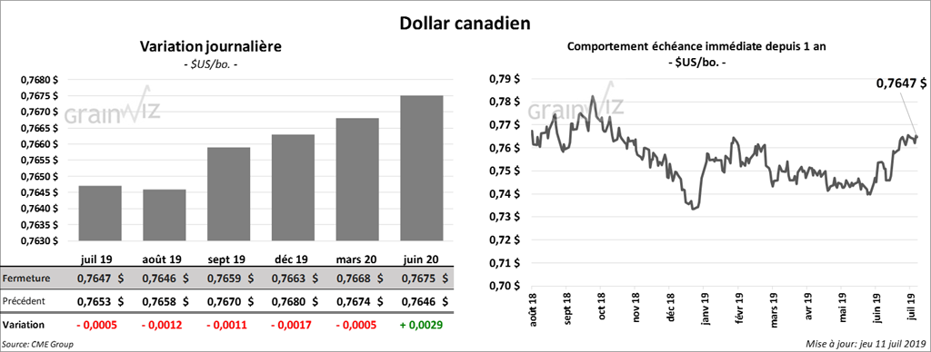 Présenté ce matin, le rapport sur les ventes à l’exportation indique une progression des ventes de l’ancienne récolte durant la semaine du 4 juillet dernier à 505,396 tonnes, ce qui est le résultat le plus élevé depuis les 6 dernières semaines. C’est aussi une hausse de 25,69 % par rapport à la même période l’an passé. Par opposition, les ventes de la nouvelle récolte de maïs US ont été décevante avec une réduction nette de 108,362 tonnes. Le Japon a été le principal acheteur avec 444,800 tonnes de maïs US 2018/2019. Par contre, il a annulé des commandes de 120,000 tonnes de maïs US 2019/2020.