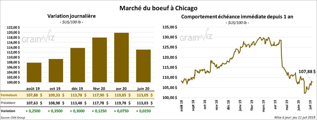 Le 10 juillet dernier, le CME feeder cattle index était en hausse de 3,50 $ à 139,32 $. Cet après-midi, la valeur du surgelé a été en baisse. La découpe «Choice» a reculé de 65 cents à 213,77 $. Celle «Select» a perdu 10 cents à 190,79 $.