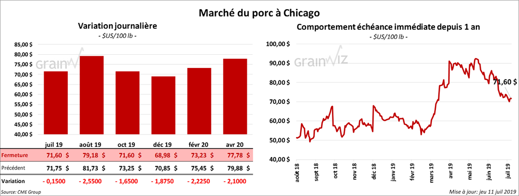 La plupart des contrats de porc à Chicago ont fini la journée avec des pertes sur 3 chiffres. Le contrat juillet 19, qui expirera lundi prochain, a perdu 15 cents.