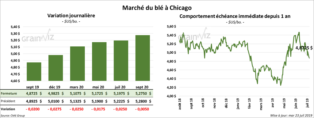 La plupart des contrats de blé US ont fini en hausse de 3 cents. À Minneapolis, le contrat septembre 19 a terminé la session en baisse.