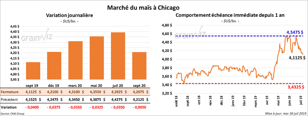 La plupart des contrats de maïs US aux échéances les plus rapprochées ont terminé la session en baisse de 5 à 6 cents. Le contrat décembre a comblé l’écart du 24 mai dernier à 4,20 $. Il a ainsi atteint son plus bas niveau en 2 mois.