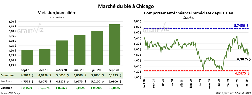 À Minneapolis comme à Kansas, les contrats de blé ont terminé la session en hausse de 3 à 6 cents, mais ceux de Chicago ont fait mieux en clôturant dans le vert de 8 à 15 cents.