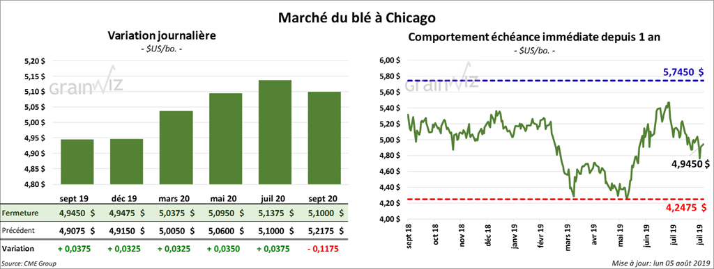 Les contrats de blé US aux échéances les plus rapprochées ont terminé la journée en hausse de 2 ¼ à 5 cents.