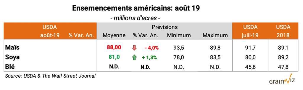 On se rappelle qu'à la fin juin dernier, le USDA avait surpris avec des ensemencements américains beaucoup plus élevés que prévu en maïs à 91,7 millions d'acres, alors que tout le monde anticipait plutôt une réduction importante. Les ensemencements de soya en baisse de 84 à 80 millions d'acres avaient aussi pris de court les marchés. Toutefois, avec la diffusion de son rapport de juin, le USDA avait pris soin d'indiquer qu'en raison du début de saison très difficile aux États-Unis, un nouveau sondage en juillet serait complété pour obtenir des chiffres plus justes. En d'autres mots, essentiellement, le USDA n'avait pas en main en juin tous les éléments nécessaires pour se prononcer avec justesse sur les ensemencements américains 2019. Ce devrait maintenant être le cas avec le nouveau sondage de juillet dernier.