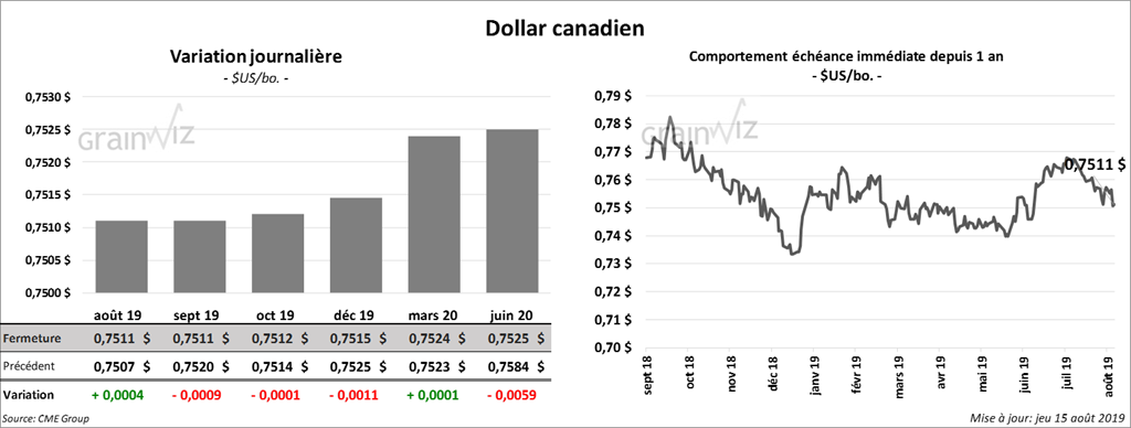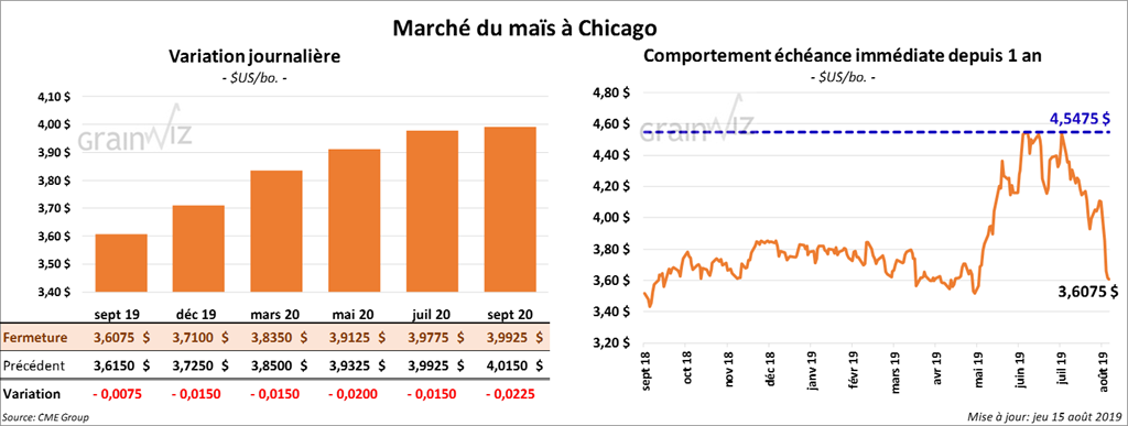 Ce matin, le USDA a rapporté que le 8 août dernier, les ventes à l’exportation de maïs US 2018/2019 ont été de 56,149 tonnes. Celles de 2019/2020 ont été de 307,591 tonnes, ce qui représente une hausse de 56 % par rapport à la semaine précédente, mais également une baisse de 71 % comparativement à la même période l’an dernier. Le total des engagements à l’exportation pour l’ancienne récolte est de 17 % moins élevé que l’an passé. Comparativement aux projections du USDA, les exportations de maïs US sont complétées à 94 %. Le rythme moyen est de 104 %. Quant aux expéditions, elles sont à 89 % des projections. Les ventes non-expédiées sont faibles pour cette période de l’année. Au cours de la semaine, la Chine a acheté 78,788 tonnes de sorgo issu de l’ancienne récolte.