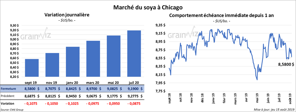 Les contrats de soya US aux échéances les plus rapprochées ont fini la session en baisse de 7 ¼ à 7 ½ cents. Le contrat de tourteau septembre 19 a clôturé en baisse de 2,80 $/tonne. L’huile a reculé de 10 points.